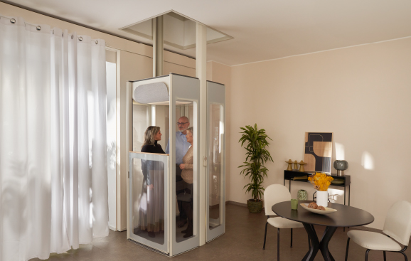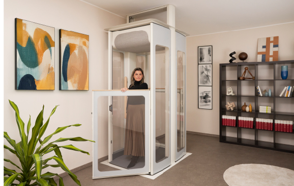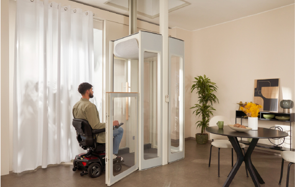 Perfektní pro přepravu až tří osob nebo jedné osoby na invalidním vozíku. Překvapivě kompaktní, ale pocitově prostorný – díky jedinečnému a elegantnímu designu. Samostatná konstrukce umožňuje instalaci prakticky kdekoli v domácnosti.