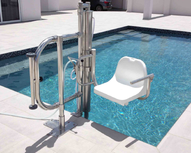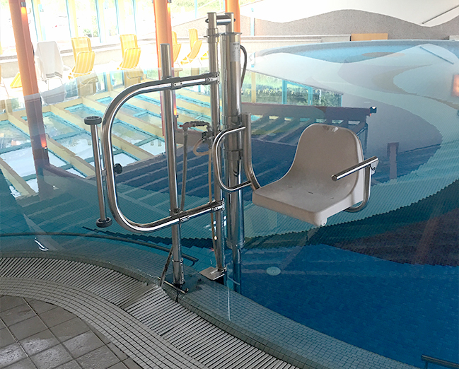 Bazénový zdvihák Stannah vám umožní samostatně vstoupit do vody a vystoupit z ní díky jednoduchému a nezávislému ovládání.