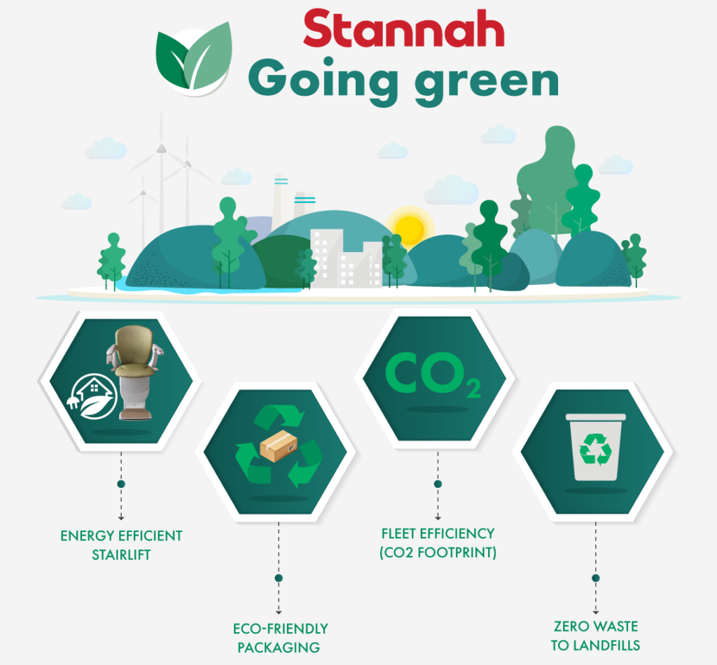 Výroba energeticky efektivních schodišťových výtahů a odstranění papírových a plastových kelímků z našich kanceláří není však jedinou věcí, kterou pro životní prostředí děláme. V posledních 10 letech společnost Stannah vykázala nárůst ekologických a udržitelných obchodních praktik. Ekologickou udržitelnost uchopila prostřednictvím „zelených“ iniciativ v rámci výrobku, servisu a výrobních postupů.